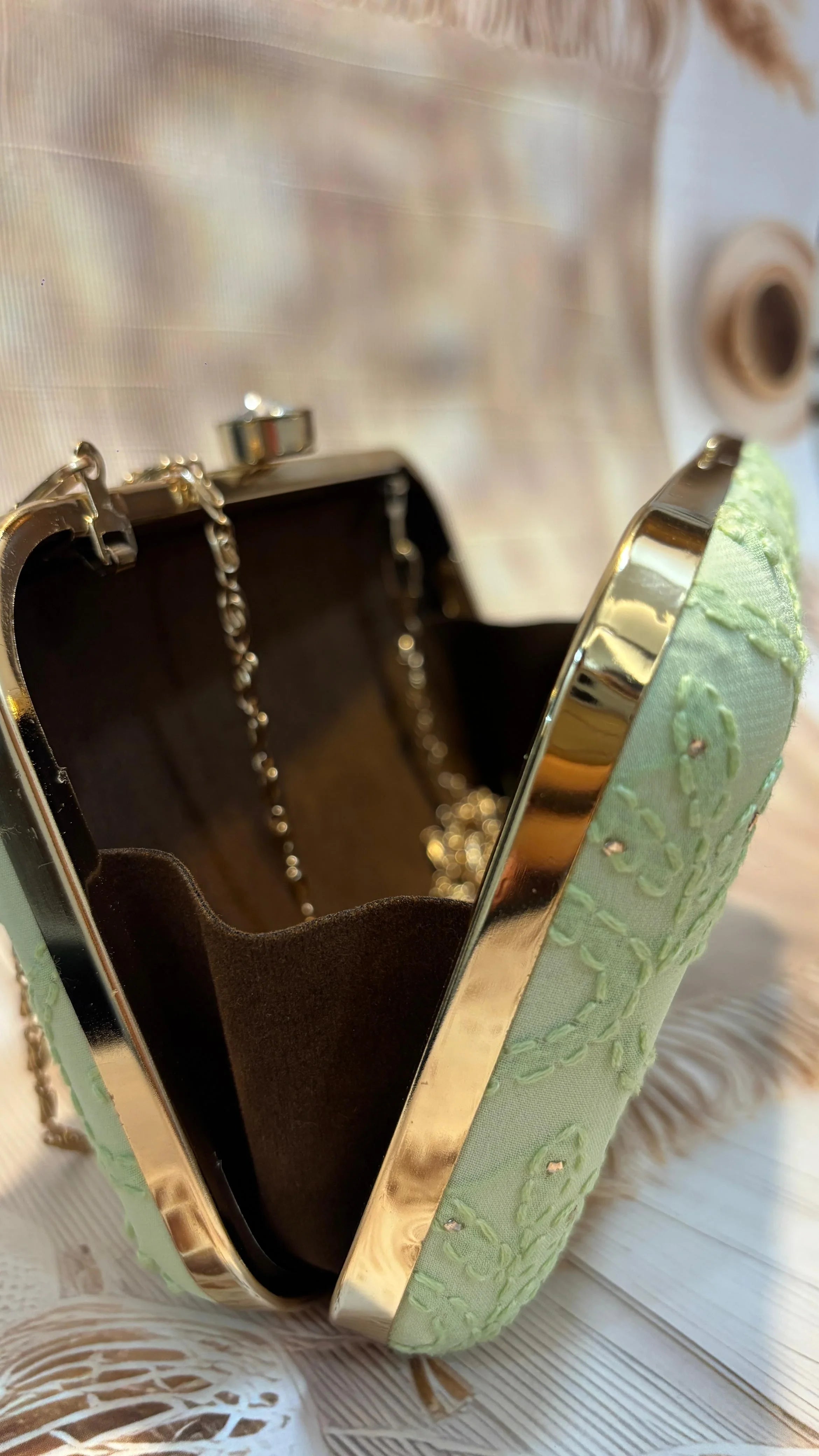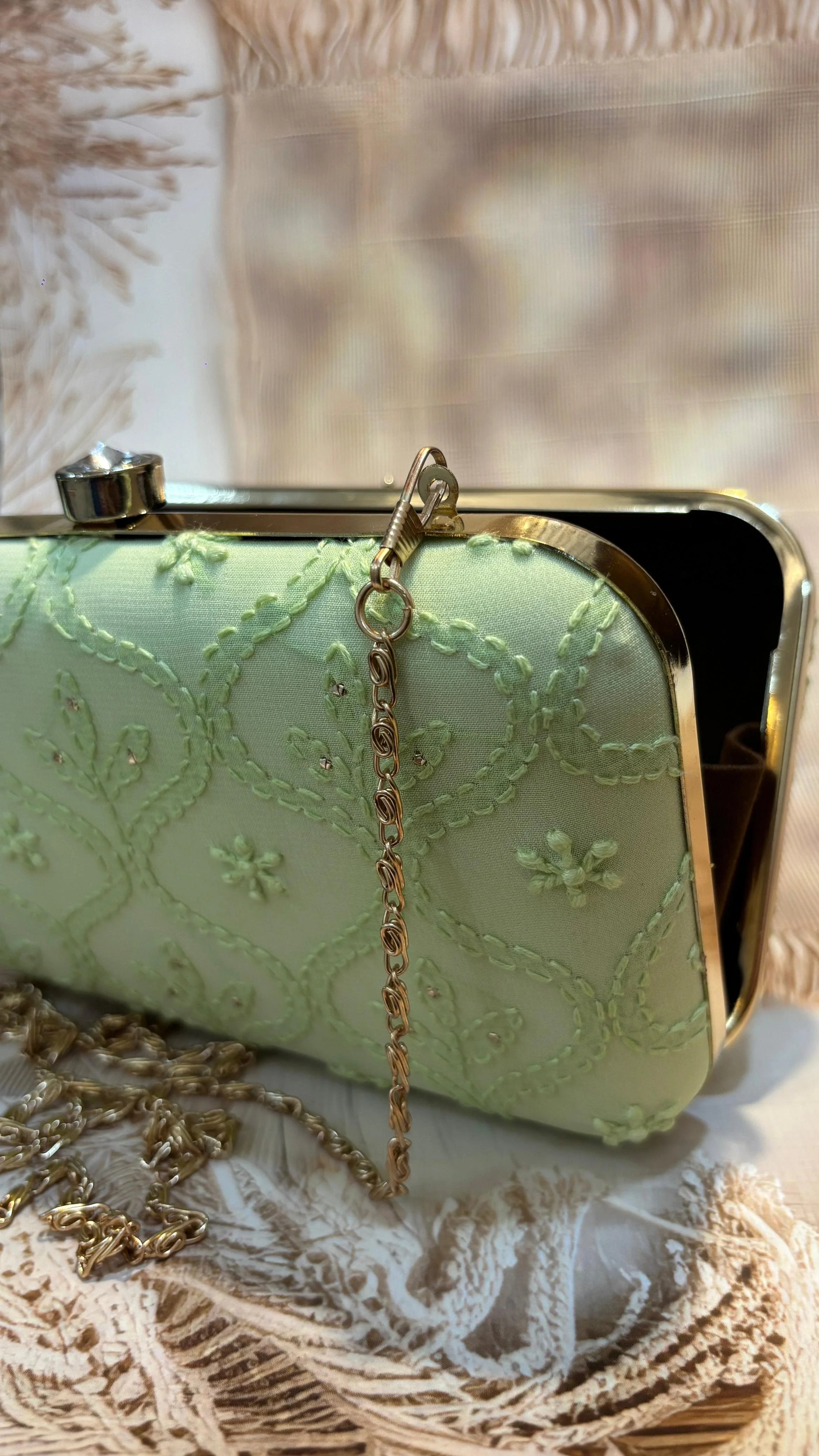 Elegant Hand Embroidered Pista Green Chikankari Floral Clutch