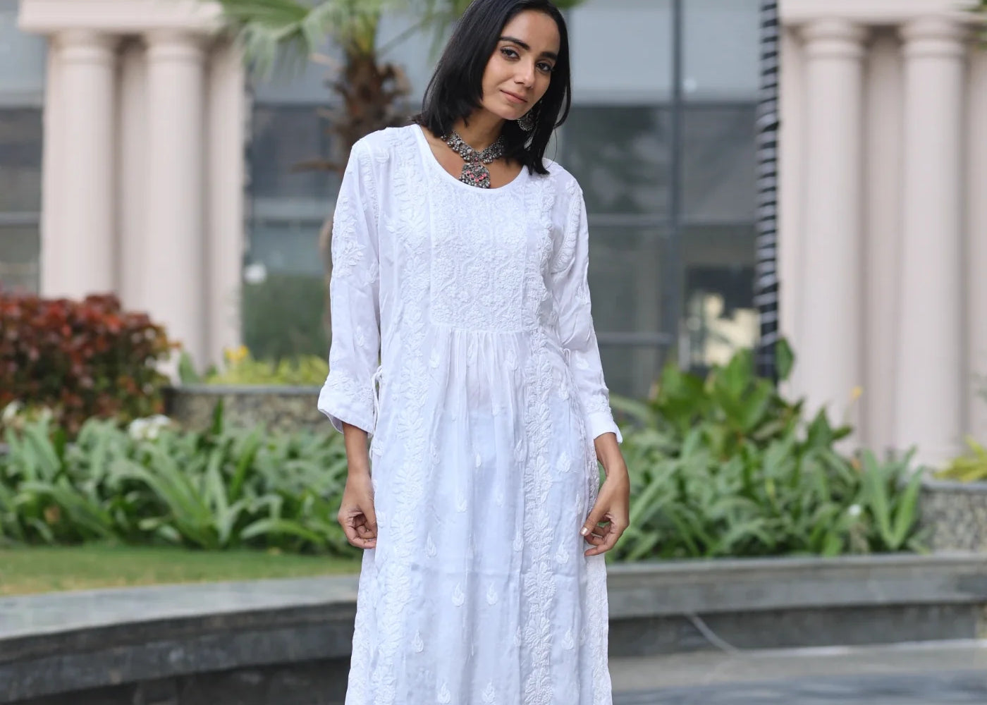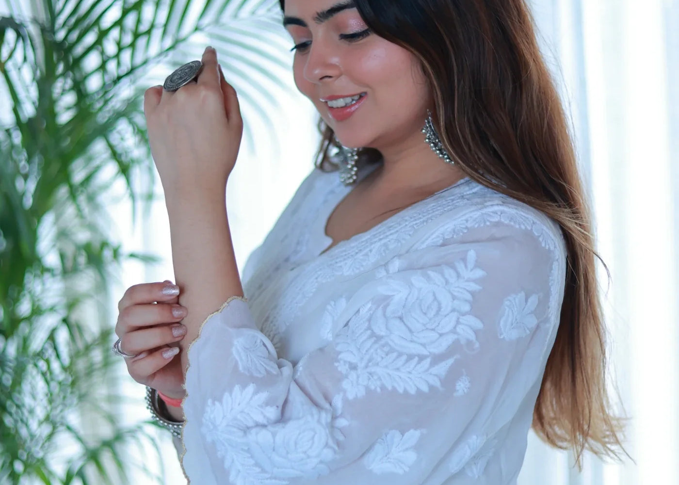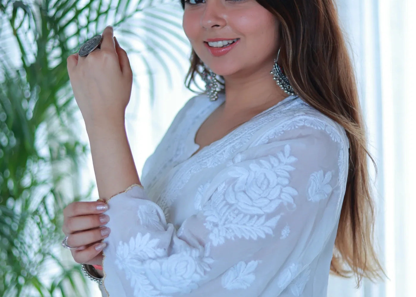Aafreen Pure White Crepe Suit Set With Mukesh Dupatta