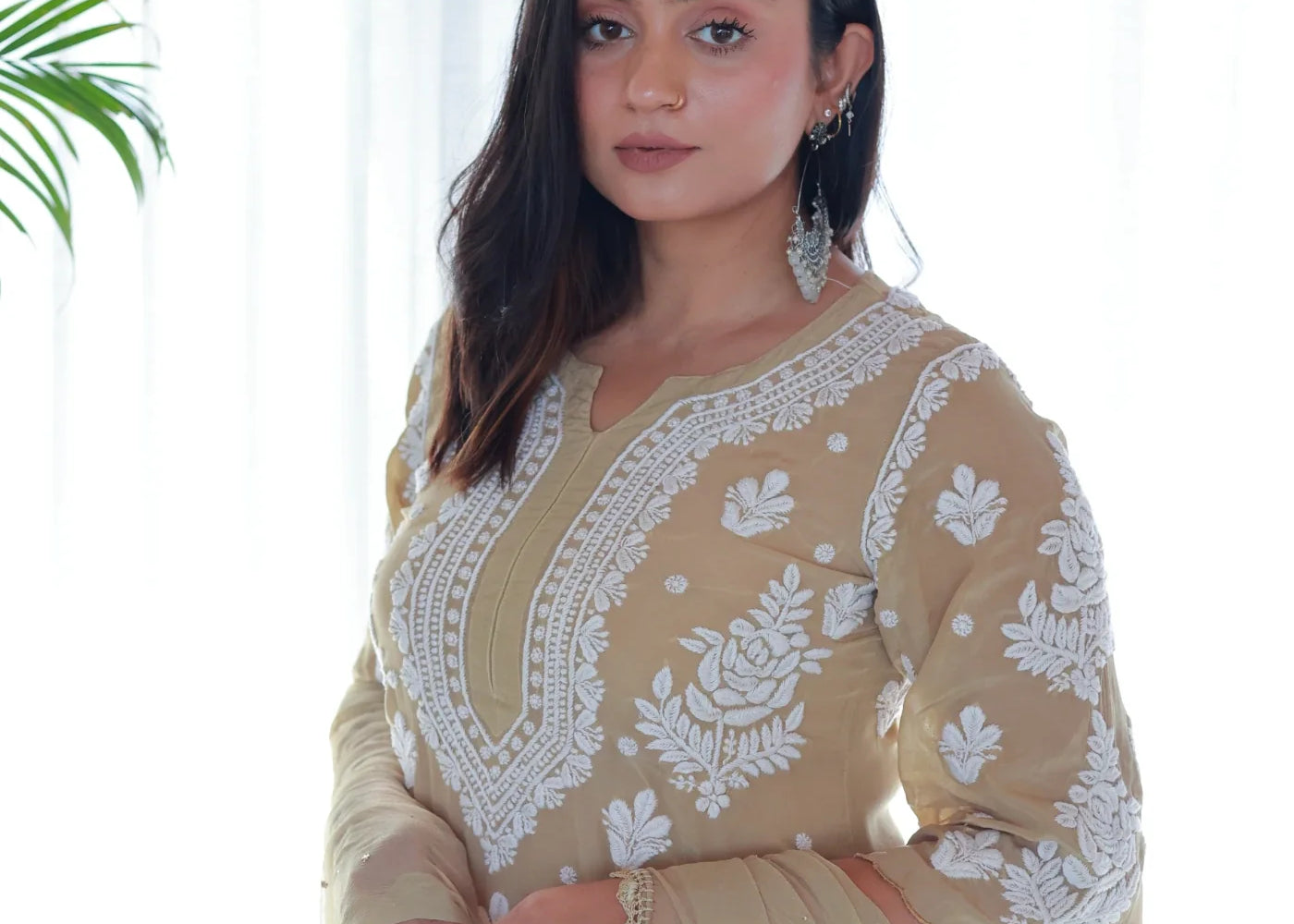 Aafreen Tan Brown Crepe Suit Set With Mukesh Dupatta
