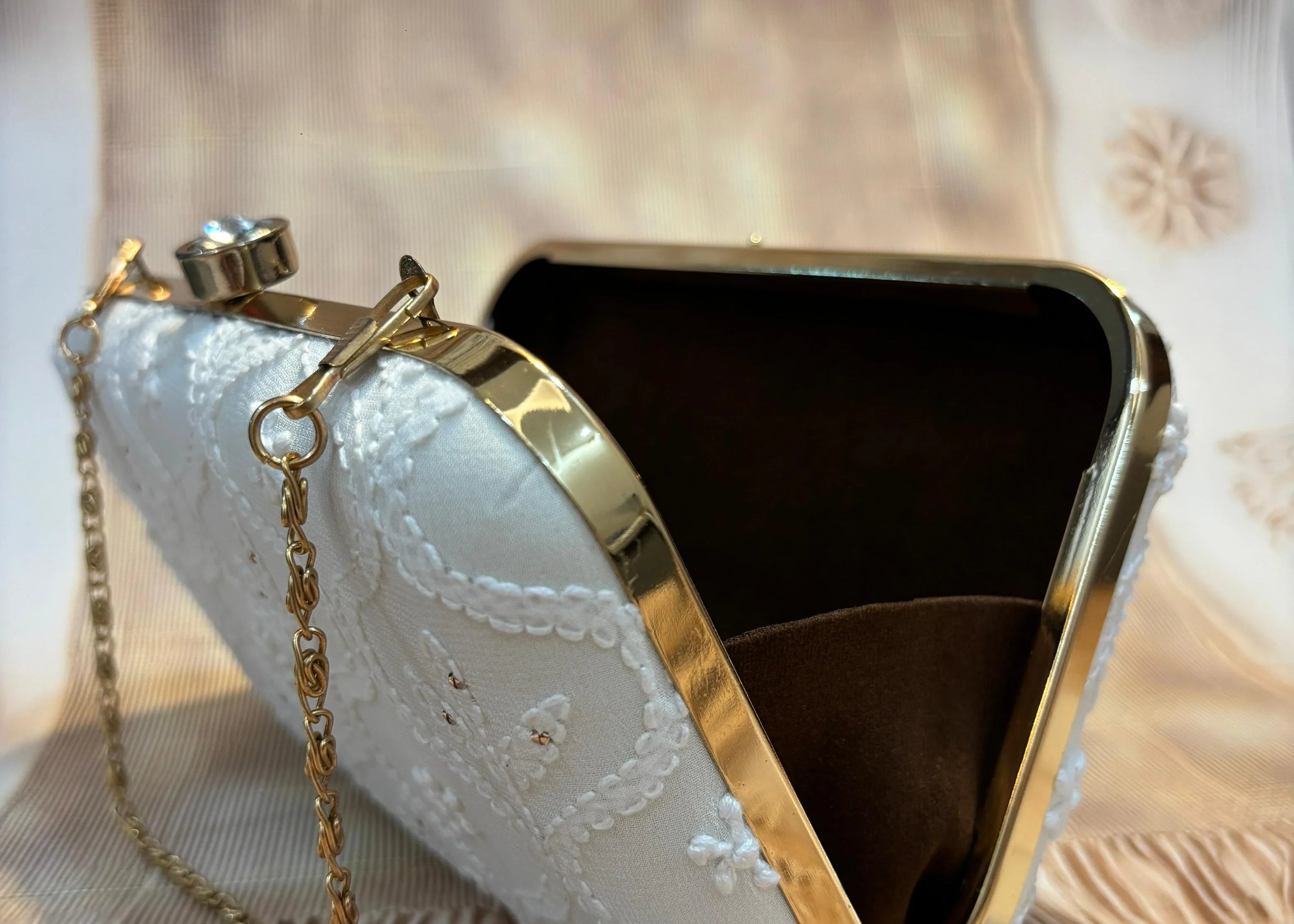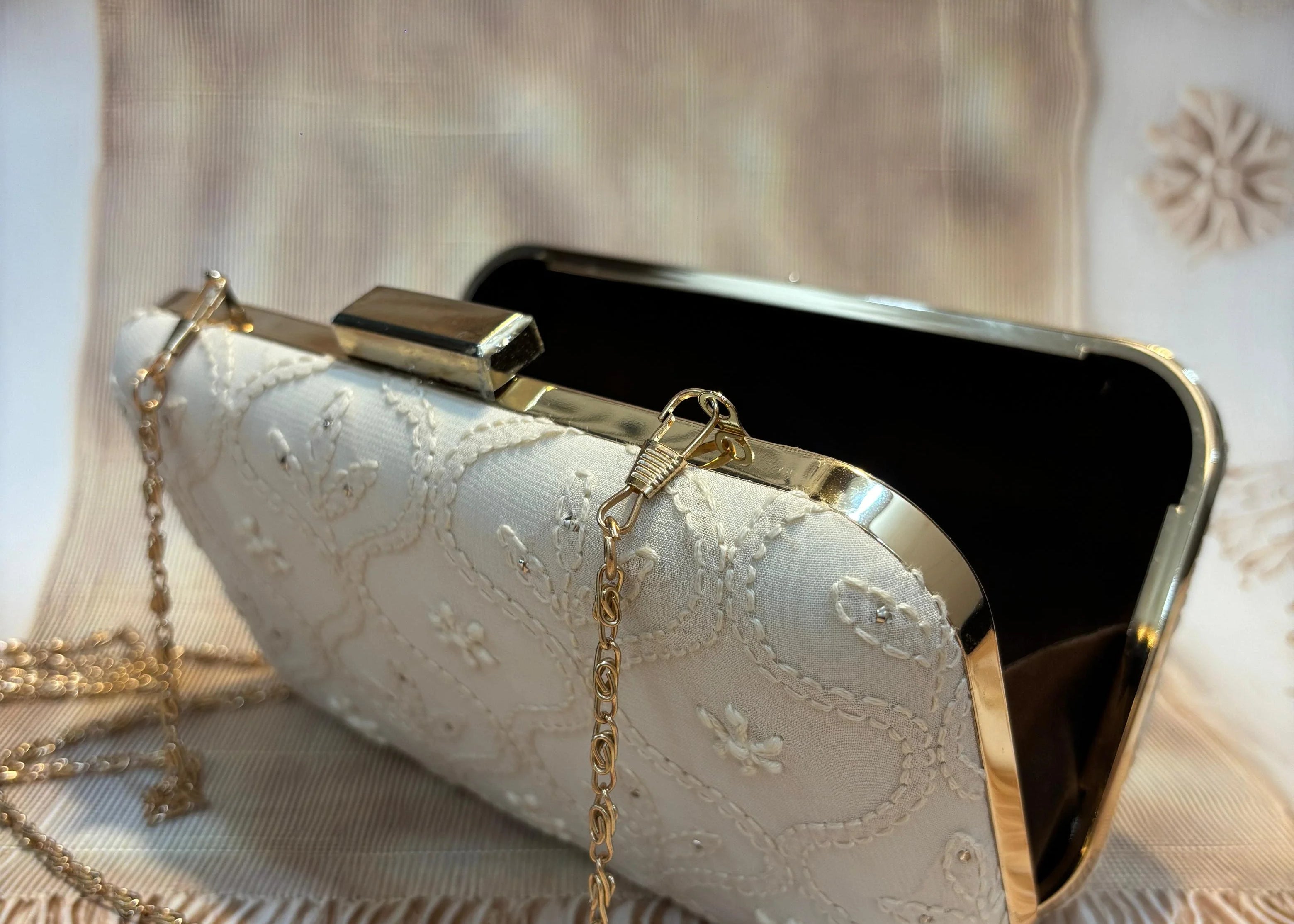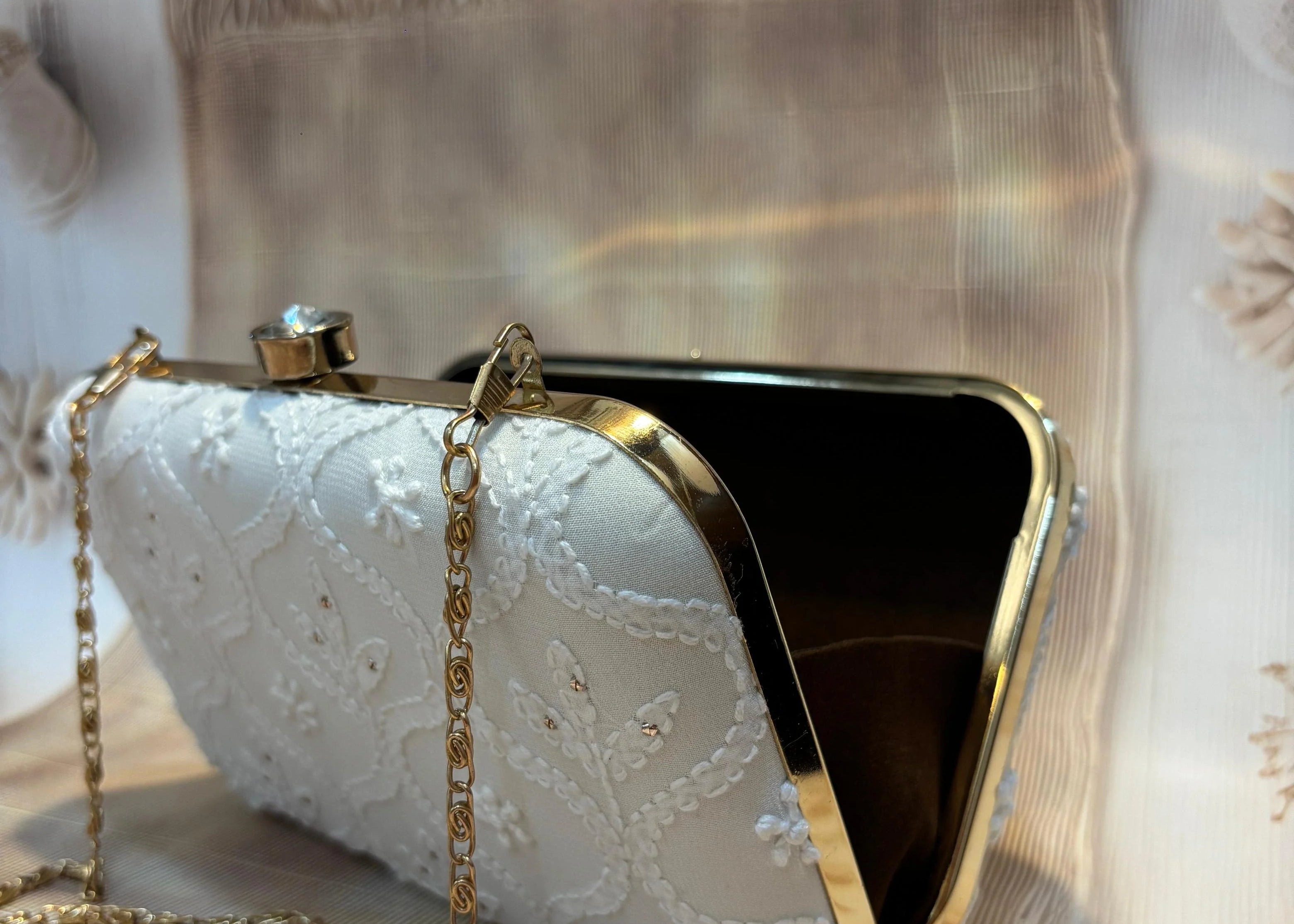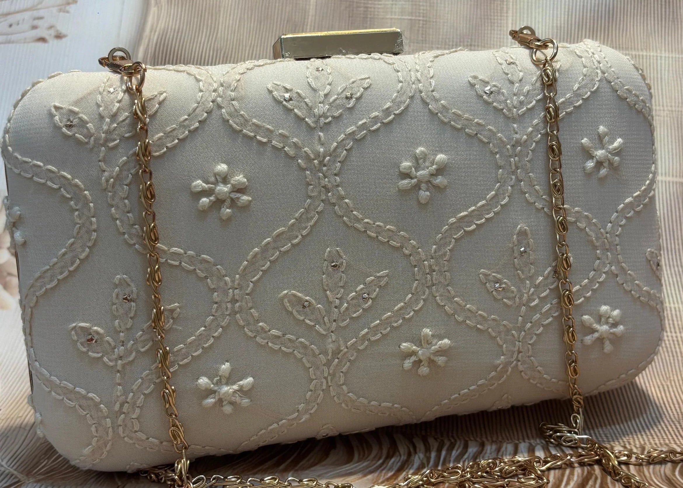 Elegant Hand Embroidered Snow White Chikankari Floral Clutch