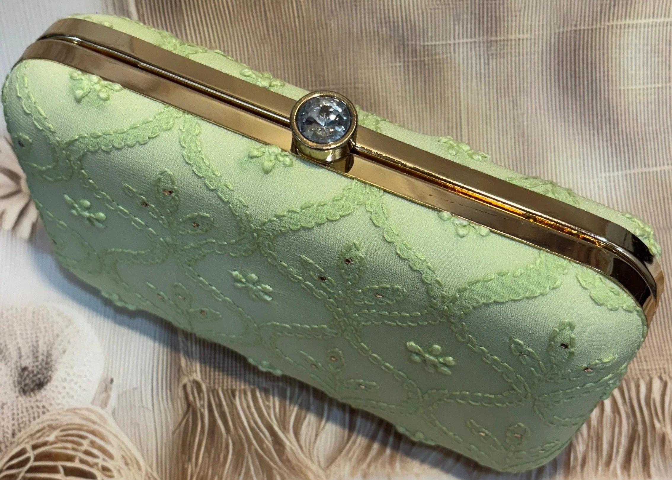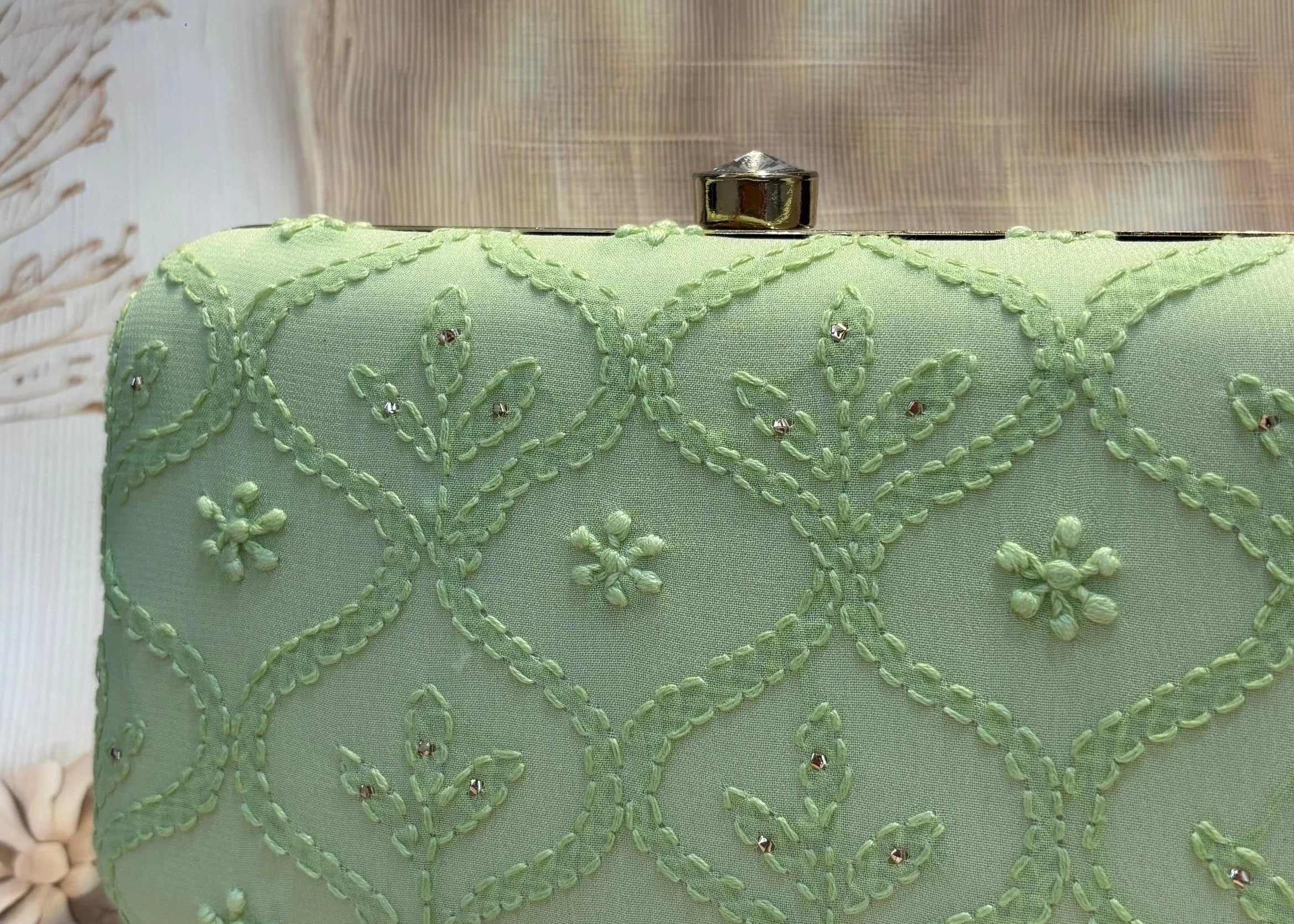 Elegant Hand Embroidered Pista Green Chikankari Floral Clutch