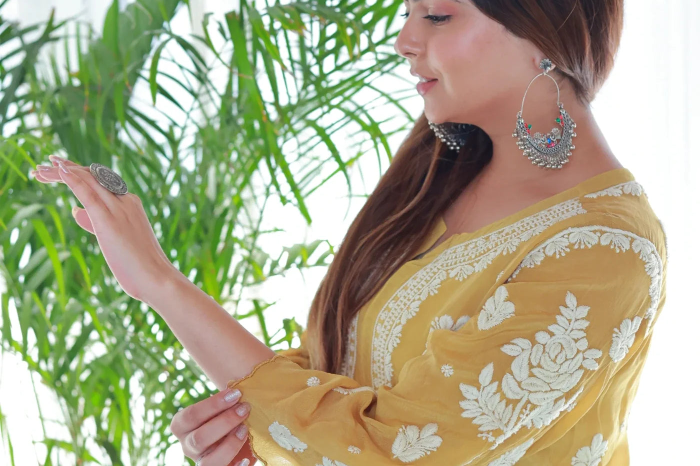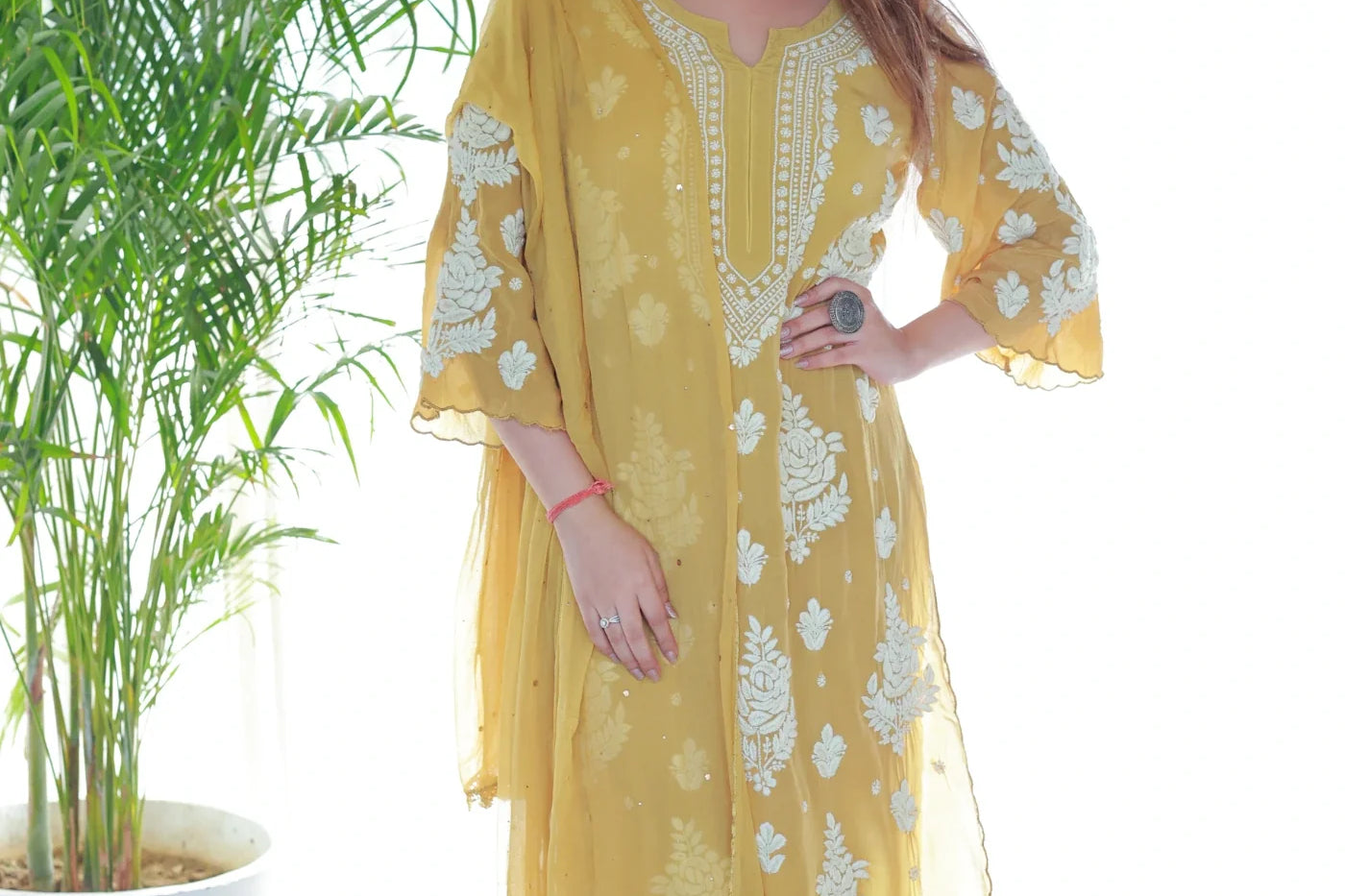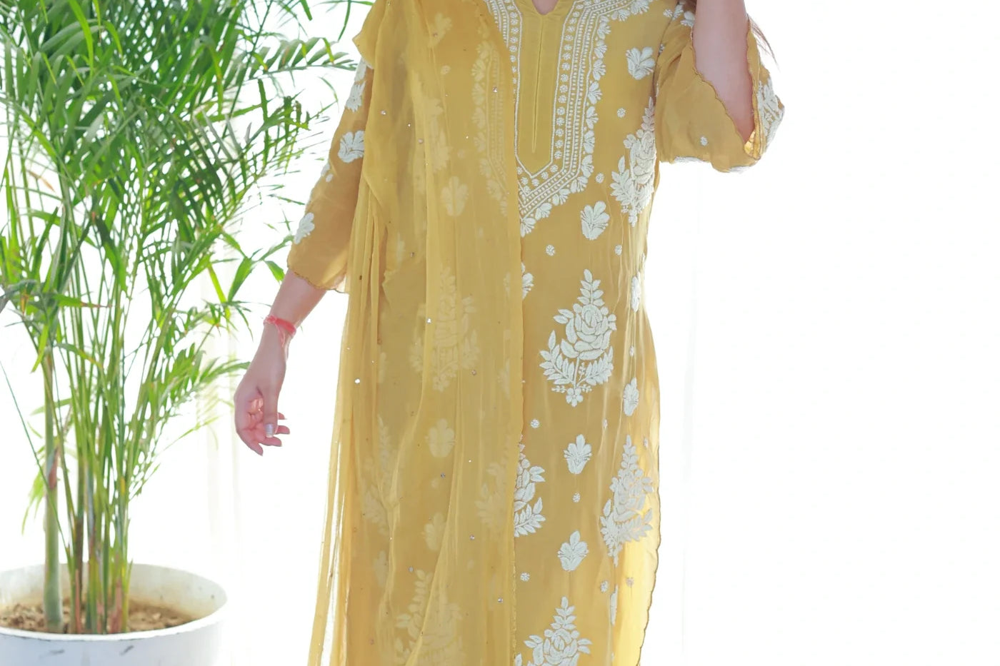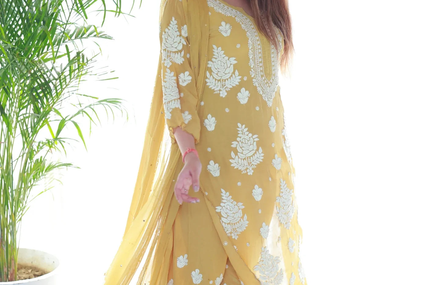 Aafreen Mustard Brown Crepe Suit Set With Mukesh Dupatta