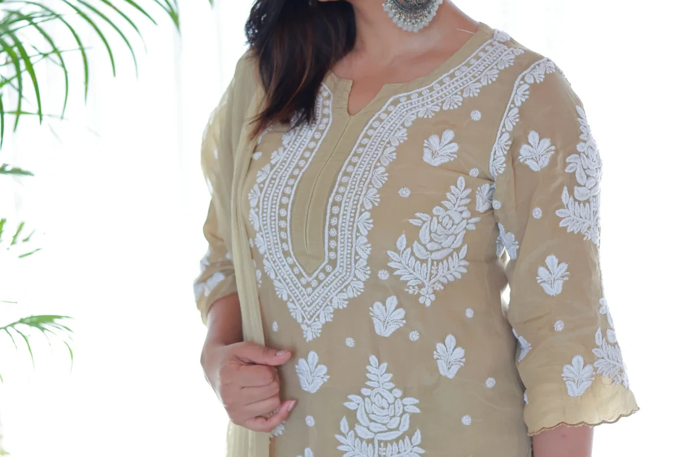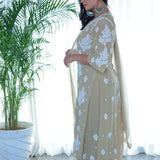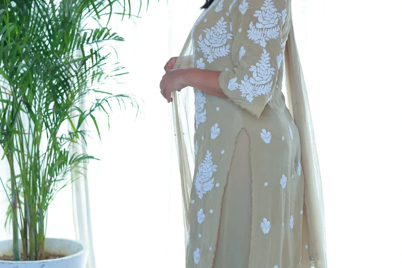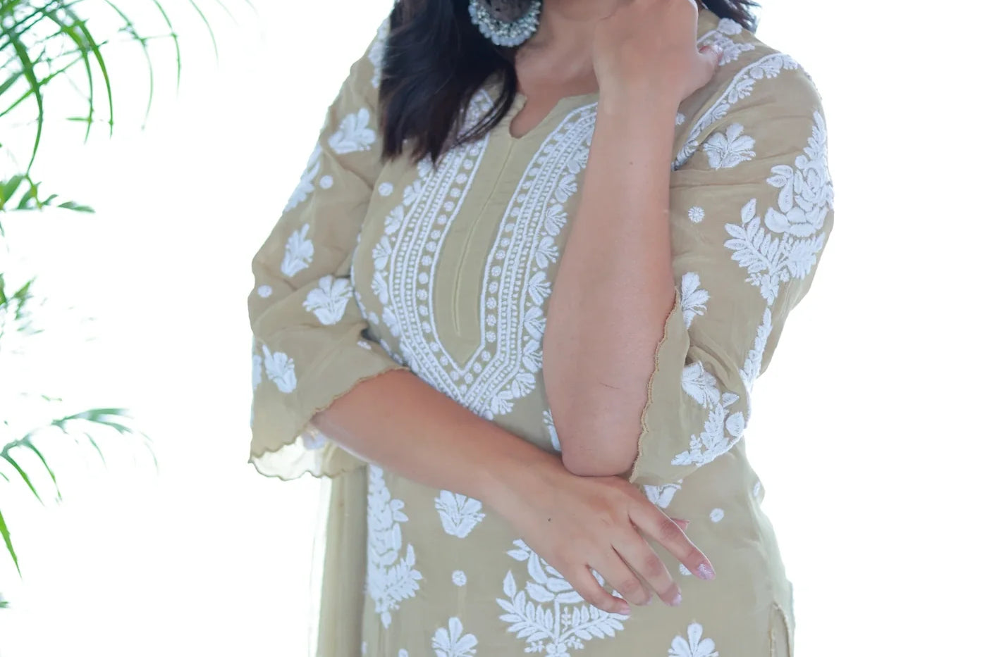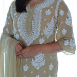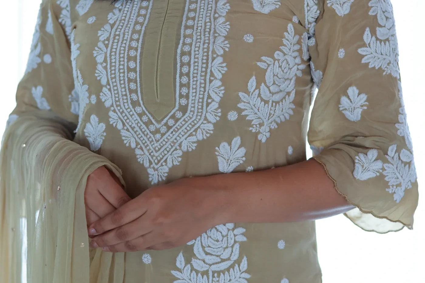 Aafreen Tan Brown Crepe Suit Set With Mukesh Dupatta